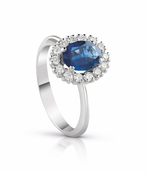 Anello fascia in oro bianco 750 con zaffiro ceylon naturale non trattato e diamanti a pavè