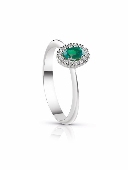 Anello con centrale ovale con smeraldo naturale e contorno di diamanti una griffe