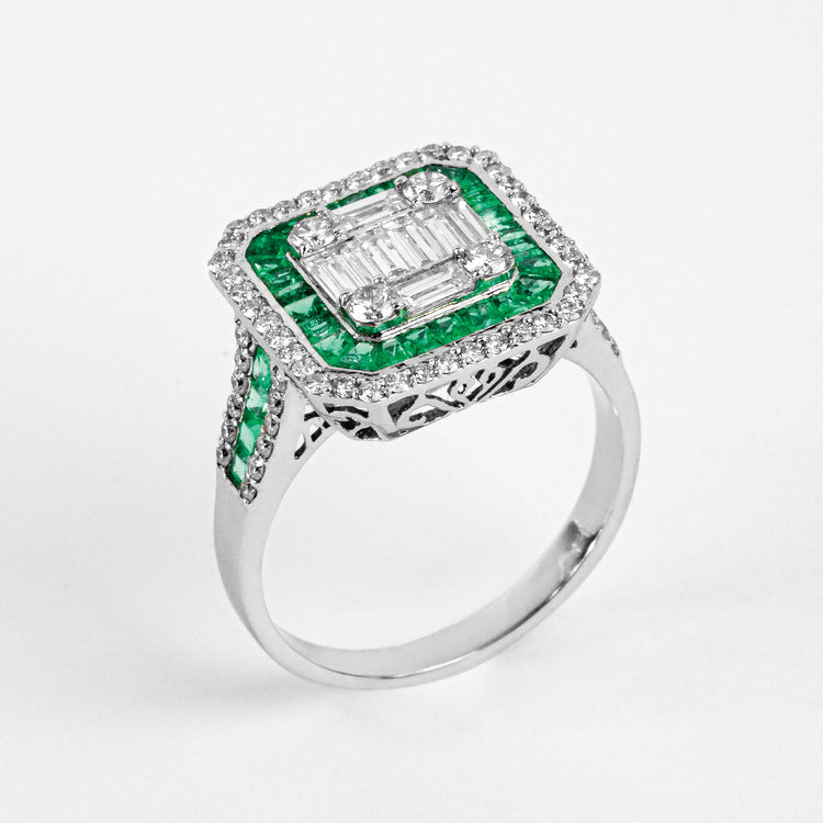 Orecchini chiusura perno clip in oro bianco 750 con smeraldi naturali taglio smeraldo e diamanti taglio rotondo